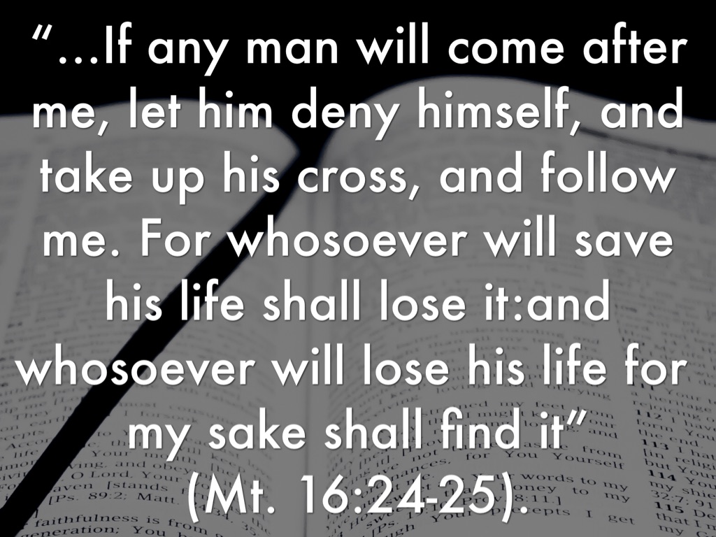 “…If any man will come after me, let him deny himself, and take up his cross, and follow me. For whosoever will save his life shall lose it:and whosoever will lose his life for my sake shall find it” (Mt. 16:24-25).