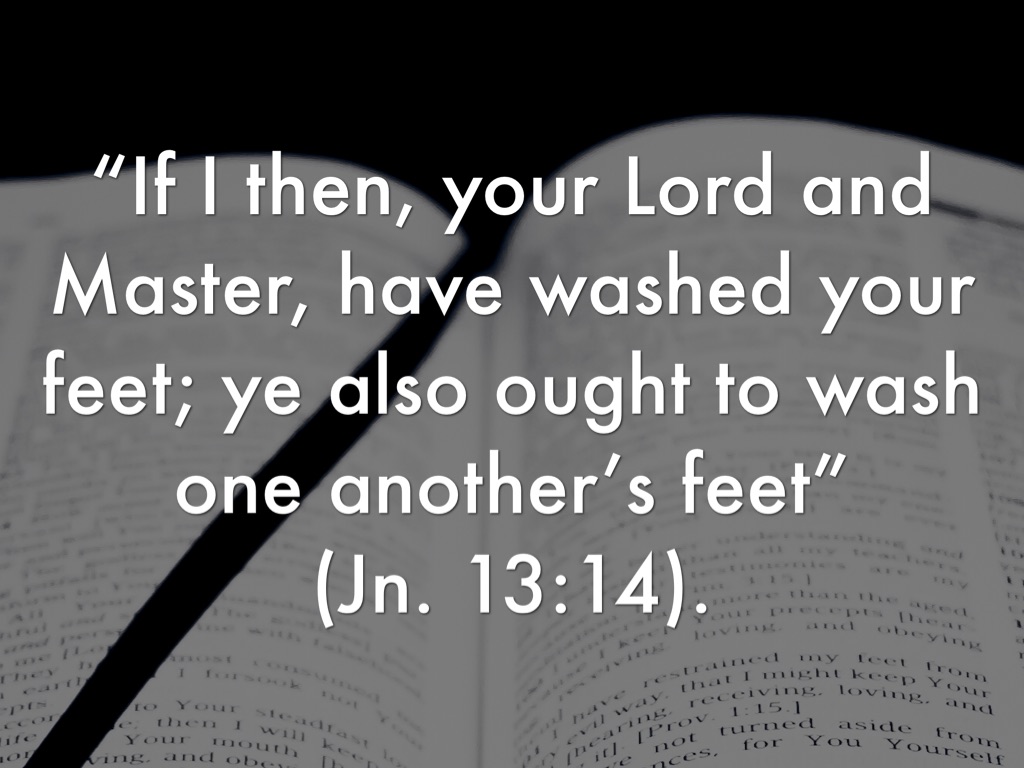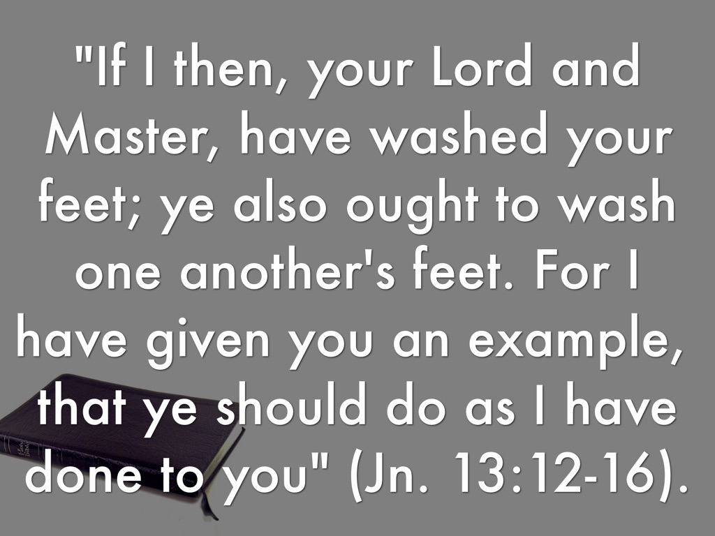 "If I then, your Lord and Master, have washed your feet; ye also ought to wash one another's feet. For I have given you an example, that ye should do as I have done to you" (Jn. 13:12-16).