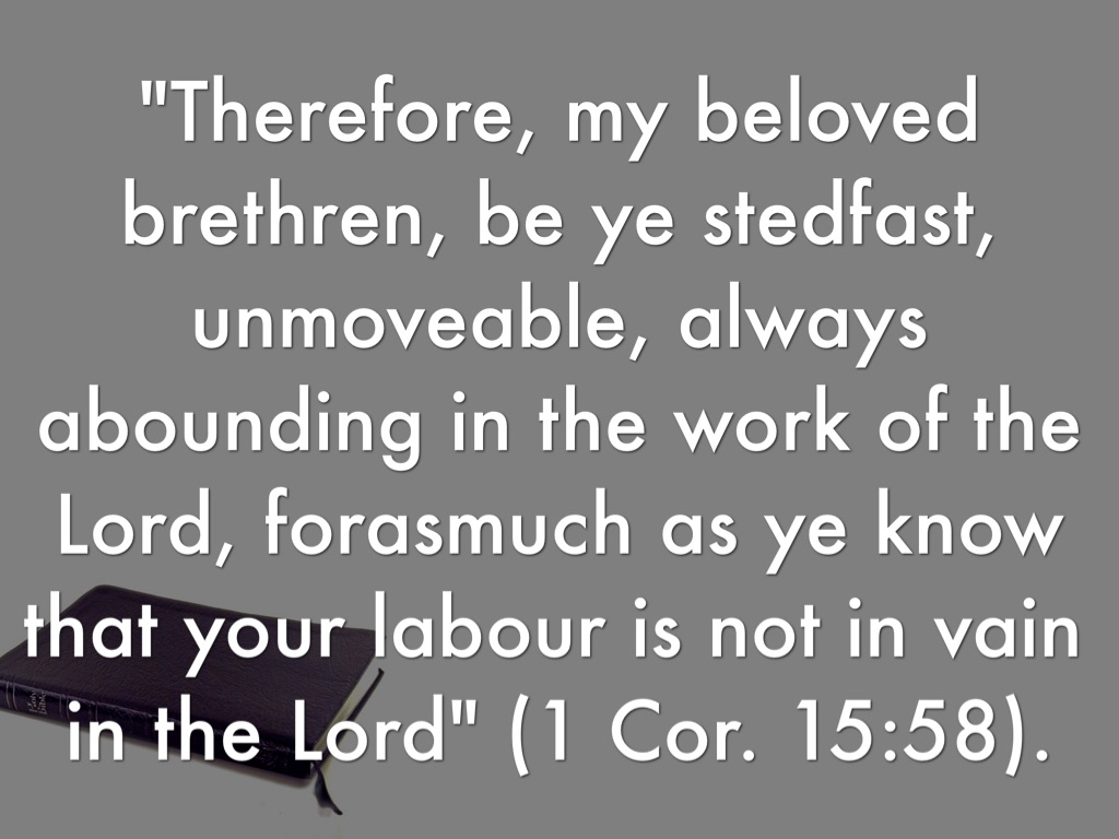 "Therefore, my beloved brethren, be ye stedfast, unmoveable, always abounding in the work of the Lord, forasmuch as ye know that your labour is not in vain in the Lord" (1 Cor. 15:58).