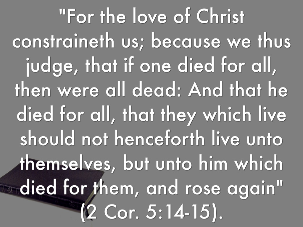 "For the love of Christ constraineth us; because we thus judge, that if one died for all, then were all dead: And that he died for all, that they which live should not henceforth live unto themselves, but unto him which died for them, and rose again" (2 Cor. 5:14-15).