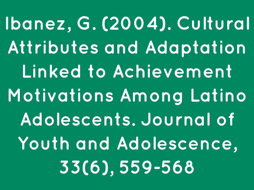 Ibanez, G. (2004). Cultural Attributes and Adaptation Linked to Achievement Motivations Among Latino Adolescents. Journal of Youth and Adolescence, 33(6), 559-568