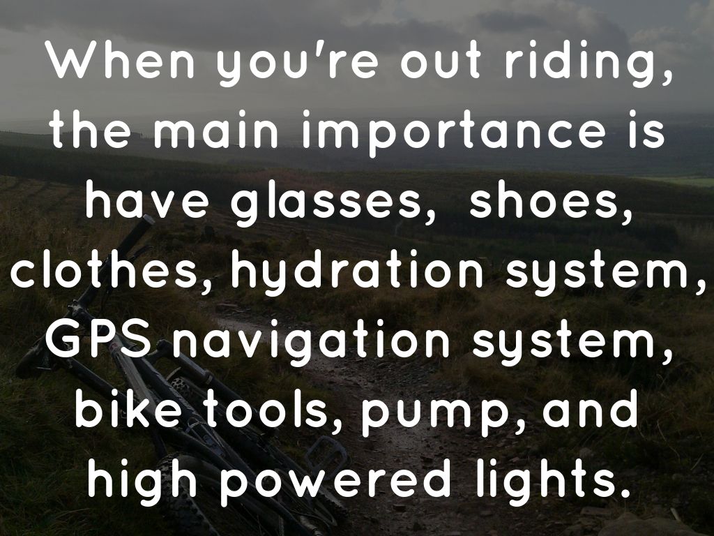 When you're out riding, the main importance is have glasses, shoes, clothes, hydration system, GPS navigation system, bike tools, pump, and high powered lights.