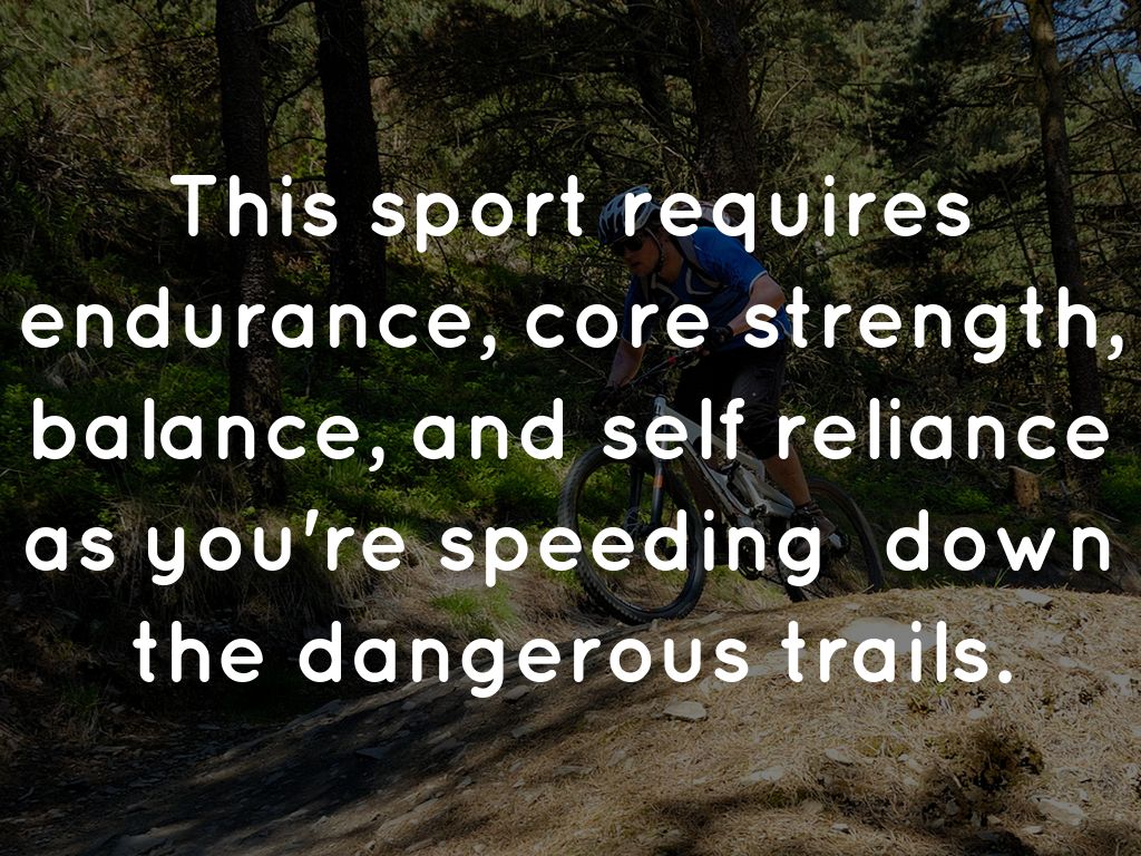 This sport requires endurance, core strength, balance, and self reliance as you're speeding down the dangerous trails.