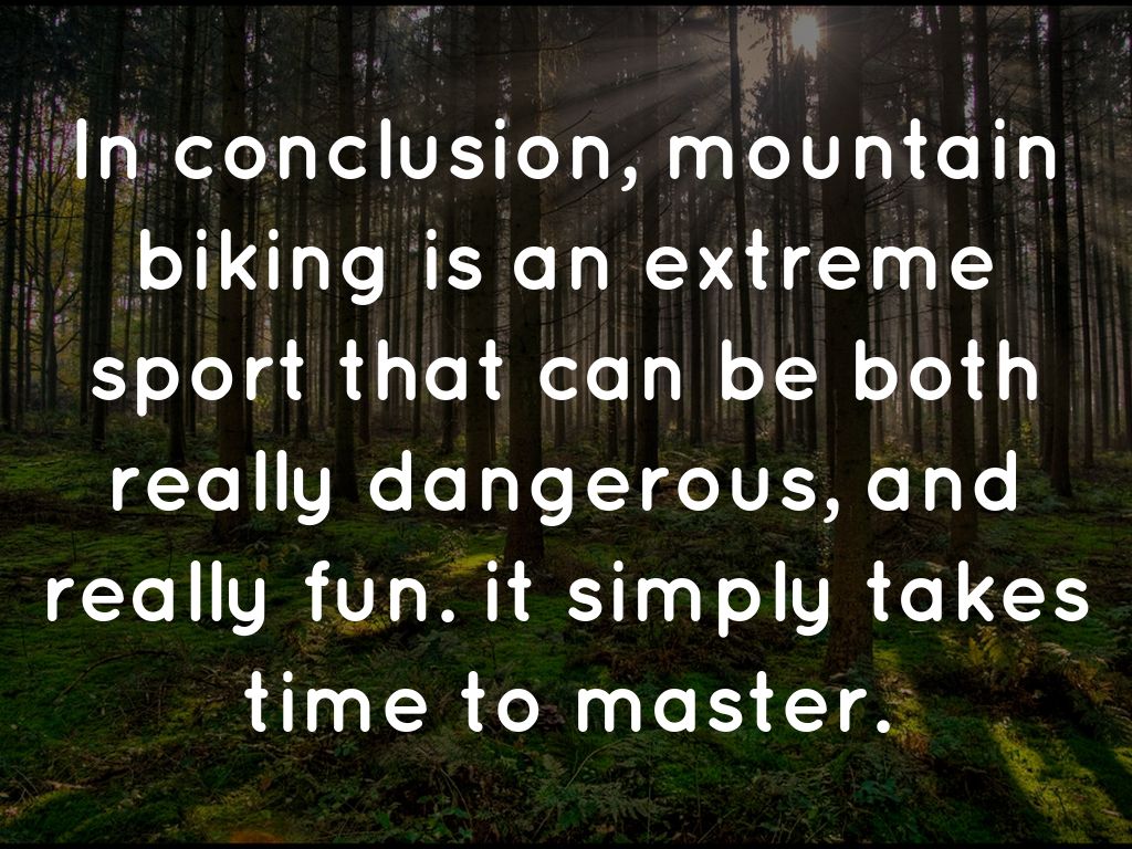 In conclusion, mountain biking is an extreme sport that can be both really dangerous, and really fun. it simply takes time to master.