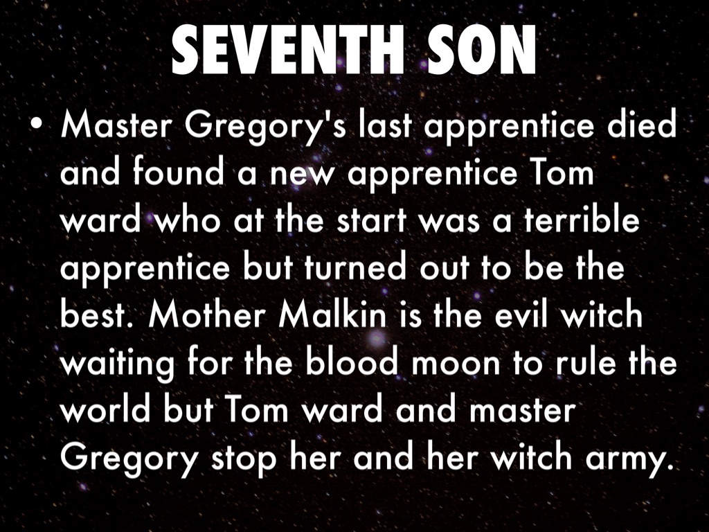 Master Gregory's last apprentice died and found a new apprentice Tom ward who at the start was a terrible apprentice but turned out to be the best. Mother Malkin is the evil witch waiting for the blood moon to rule the world but Tom ward and master Gregory stop her and her witch army.