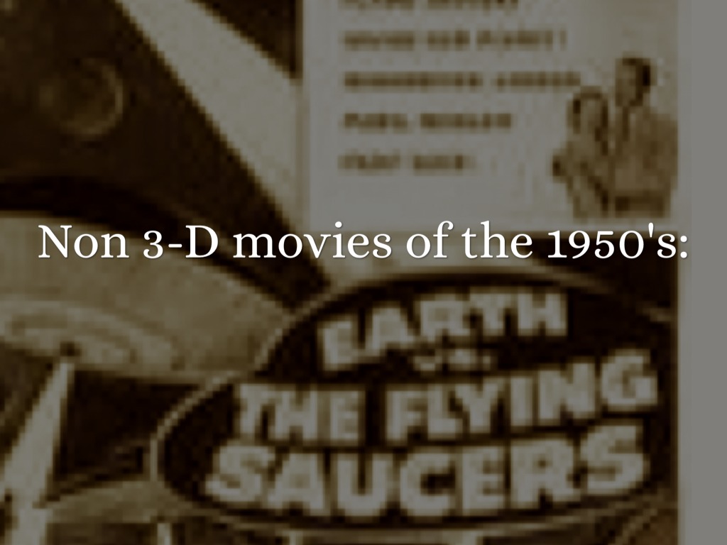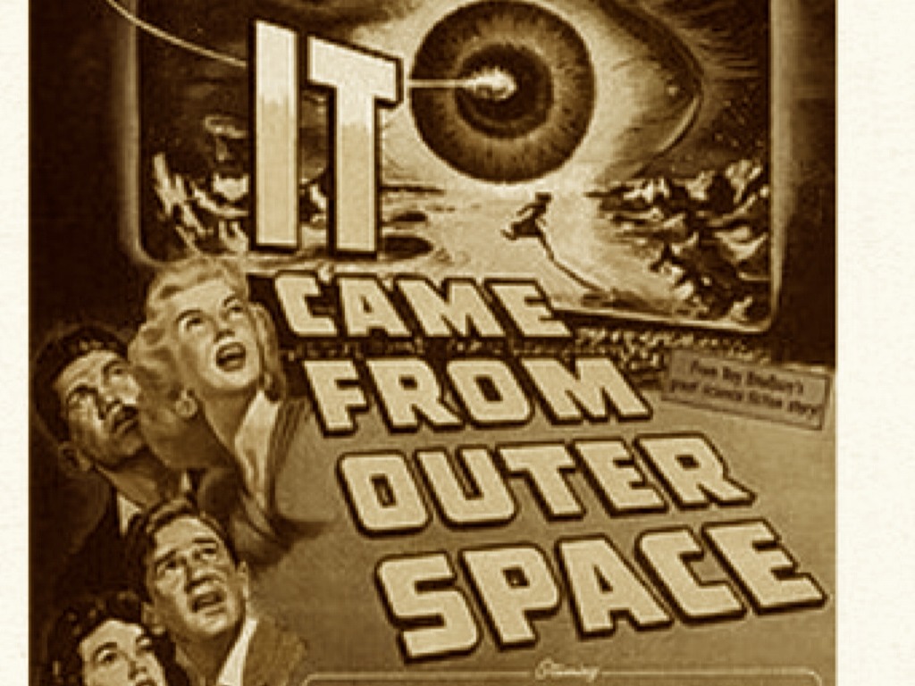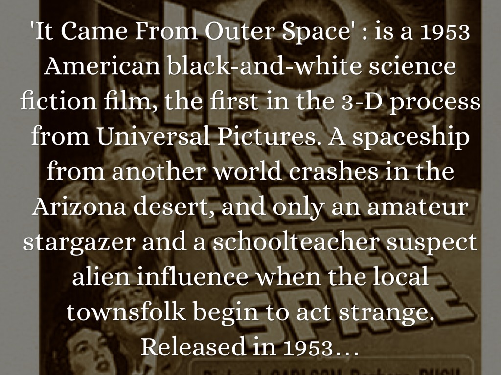 'It Came From Outer Space' : is a 1953 American black-and-white science fiction film, the first in the 3-D process from Universal Pictures. A spaceship from another world crashes in the Arizona desert, and only an amateur stargazer and a schoolteacher suspect alien influence when the local townsfolk begin to act strange.