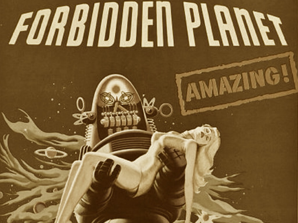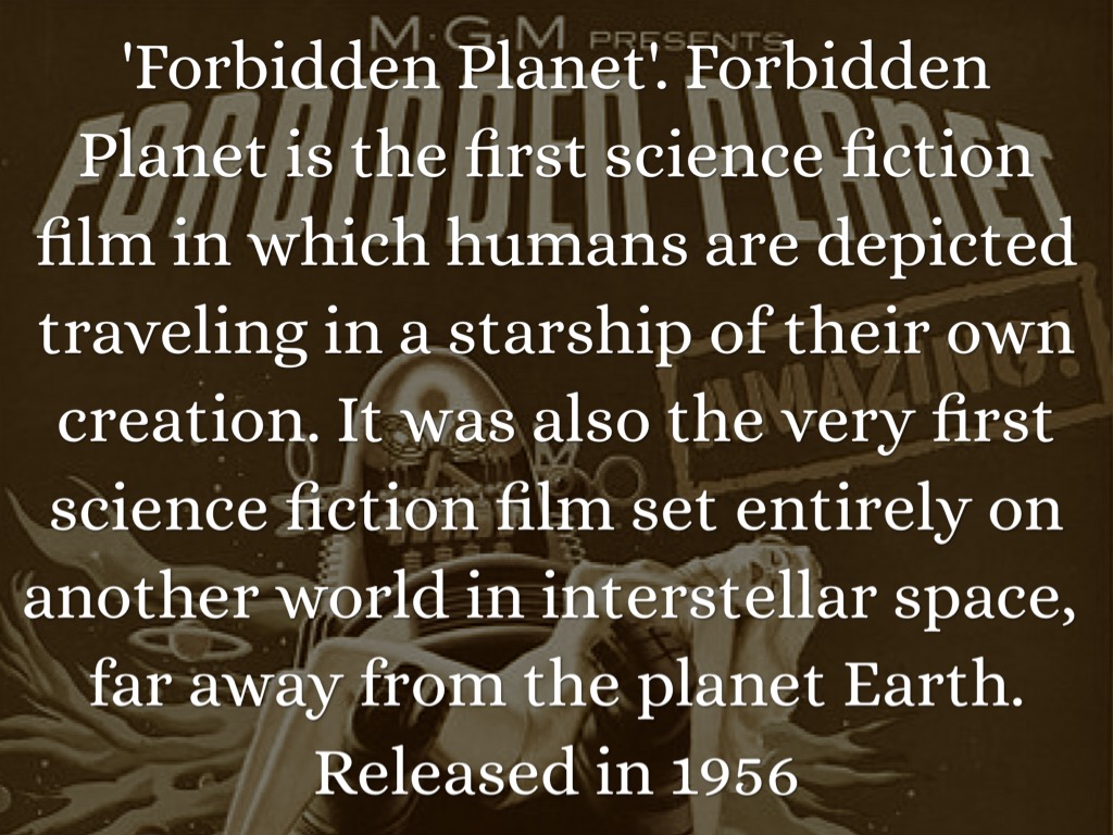 'Forbidden Planet'. Forbidden Planet is the first science fiction film in which humans are depicted traveling in a starship of their own creation. It was also the very first science fiction film set entirely on another world in interstellar space, far away from the planet Earth.