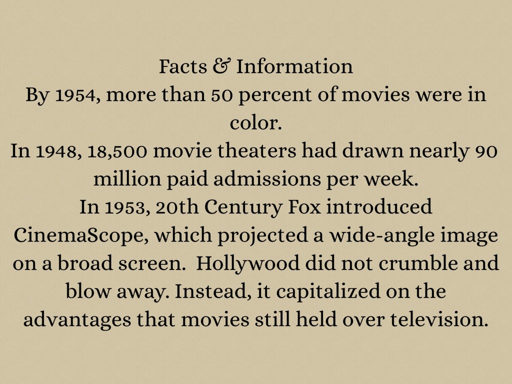 In 1953, 20th Century Fox introduced CinemaScope, which projected a wide-angle image on a broad screen. Hollywood did not crumble and blow away. Instead, it capitalized on the advantages that movies still held over television.