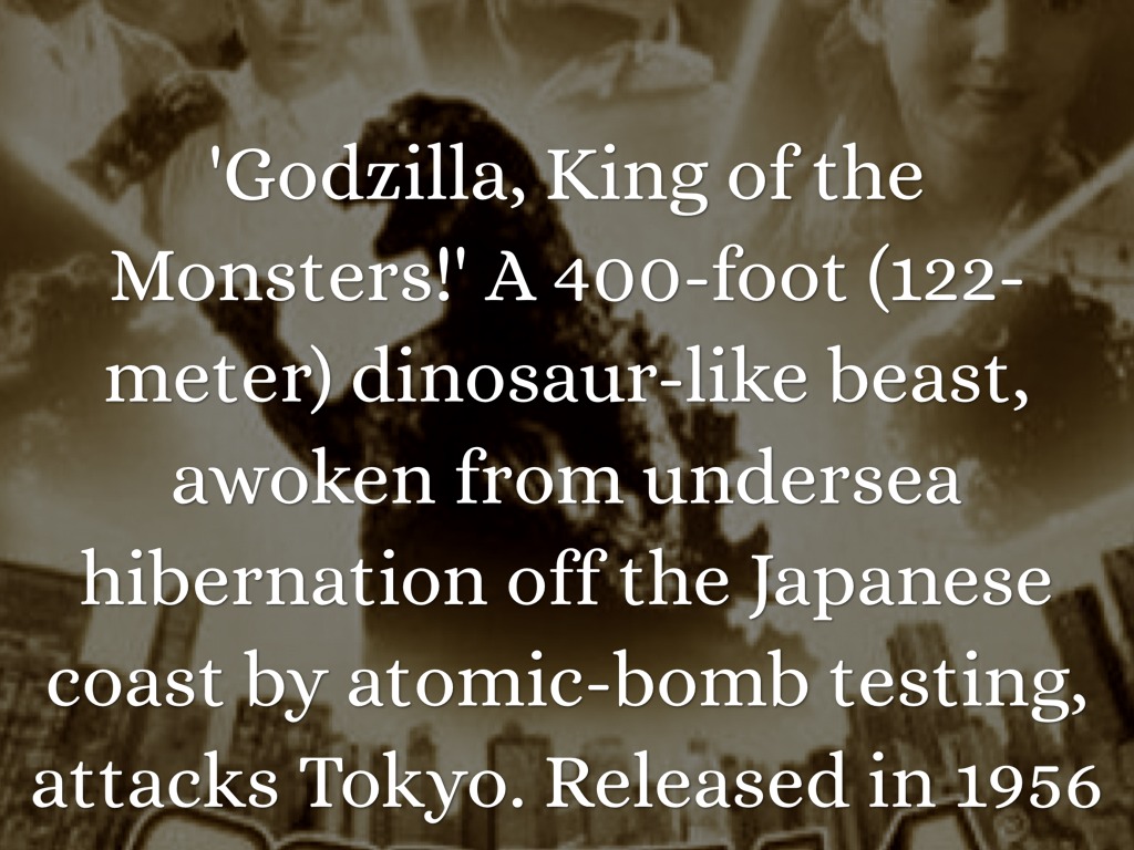 'Godzilla, King of the Monsters!' A 400-foot (122-meter) dinosaur-like beast, awoken from undersea hibernation off the Japanese coast by atomic-bomb testing, attacks Tokyo. Released in 1956
