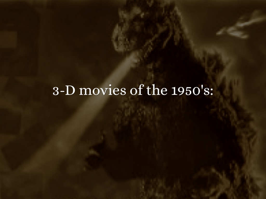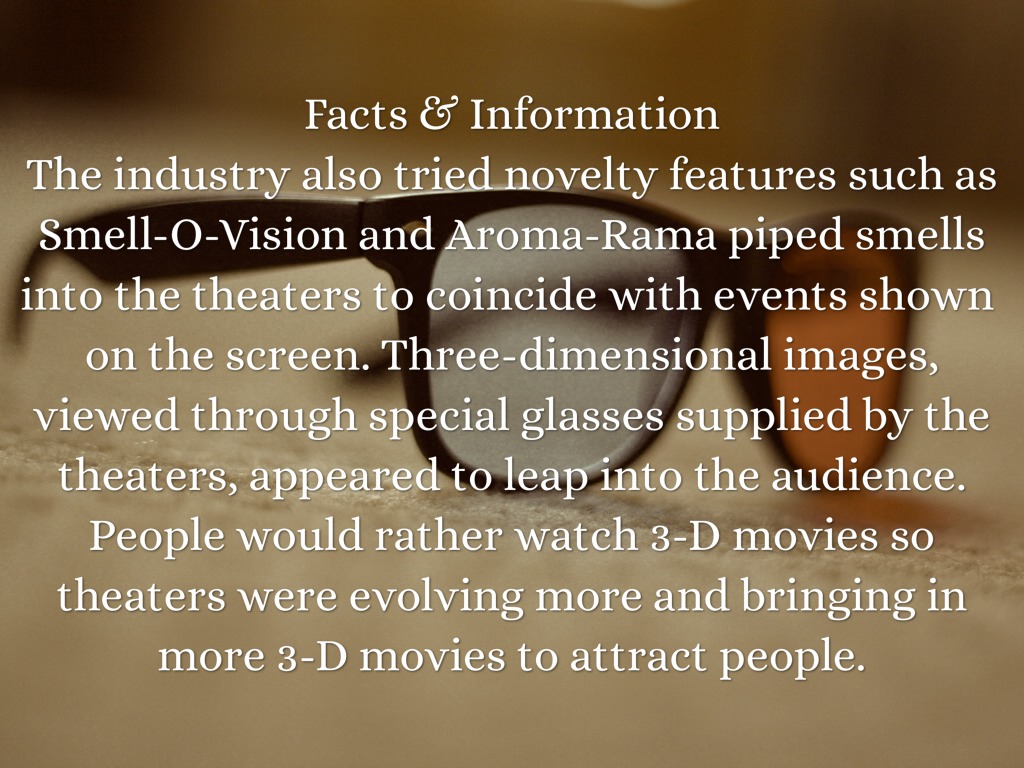 The industry also tried novelty features such as Smell-O-Vision and Aroma-Rama piped smells into the theaters to coincide with events shown on the screen. Three-dimensional images, viewed through special glasses supplied by the theaters, appeared to leap into the audience. People would rather watch 3-D movies so theaters were evolving more and bringing in more 3-D movies to attract people.