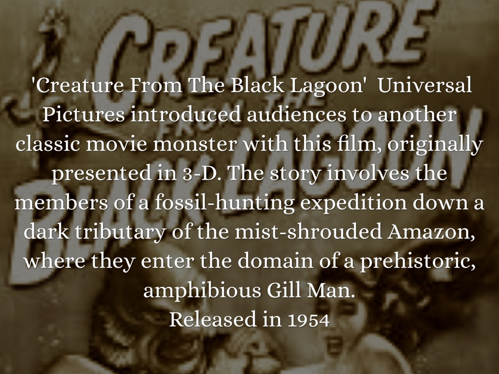 'Creature From The Black Lagoon' Universal Pictures introduced audiences to another classic movie monster with this film, originally presented in 3-D. The story involves the members of a fossil-hunting expedition down a dark tributary of the mist-shrouded Amazon, where they enter the domain of a prehistoric, amphibious Gill Man.