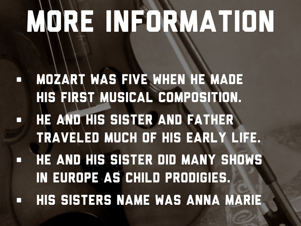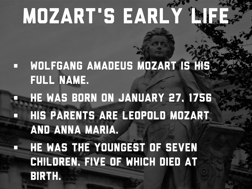 WOLFGANG AMADEUS MOZART IS HIS FULL NAME.HE WAS BORN ON JANUARY 27, 1756.HIS PARENTS ARE LEOPOLD MOZART AND ANNA MARIA.HE WAS THE YOUNGEST OF SEVEN CHILDREN, FIVE OF WHICH DIED AT BIRTH.