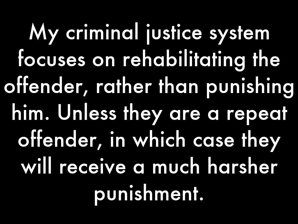 My criminal justice system focuses on rehabilitating the offender, rather than punishing him. Unless they are a repeat offender, in which case they will receive a much harsher punishment.