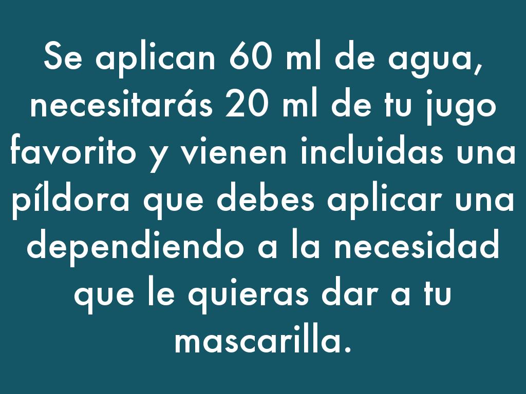 Se aplican 60 ml de agua, necesitarás 20 ml de tu jugo favorito y vienen incluidas una píldora que debes aplicar una dependiendo a la necesidad que le quieras dar a tu mascarilla.
