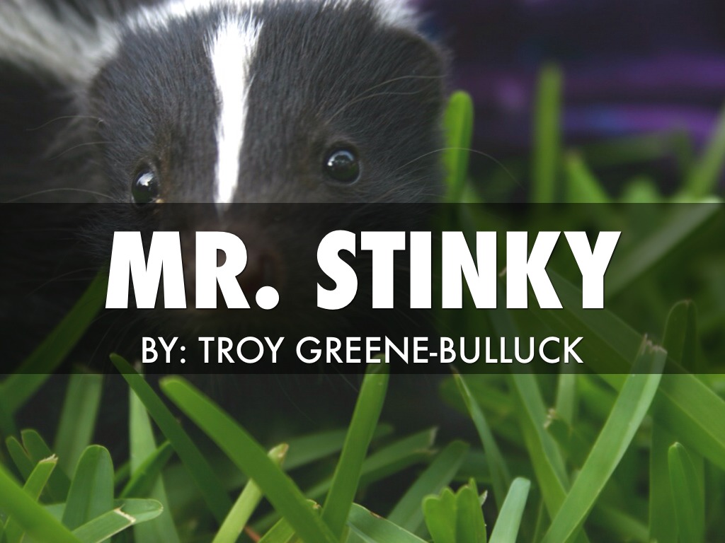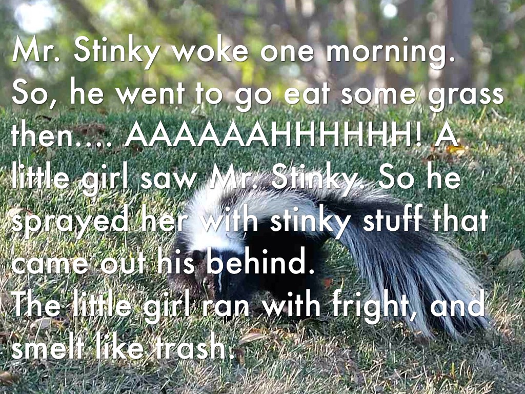Mr. Stinky woke one morning. So, he went to go eat some grass then.... AAAAAAHHHHHH! A little girl saw Mr. Stinky. So he sprayed her with stinky stuff that came out his behind. The little girl ran with fright, and smelt like trash.