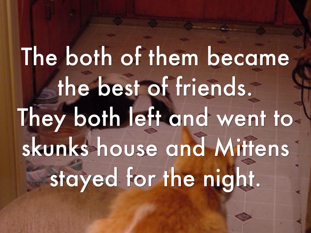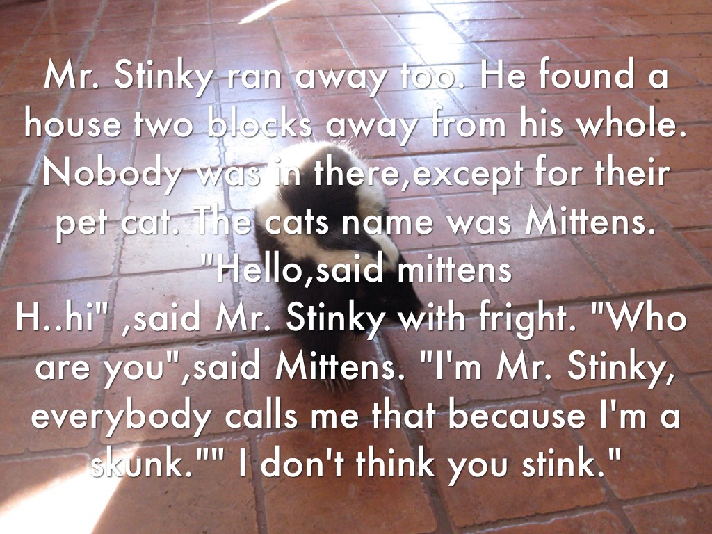 Mr. Stinky ran away too. He found a house two blocks away from his whole. Nobody was in there,except for their pet cat. The cats name was Mittens. "Hello,said mittens H..hi" ,said Mr. Stinky with fright. "Who are you",said Mittens. "I'm Mr. Stinky, everybody calls me that because I'm a skunk."" I don't think you stink."