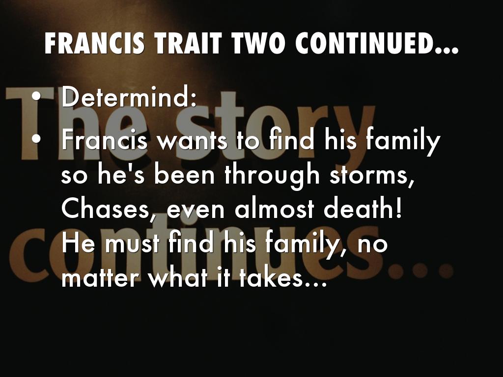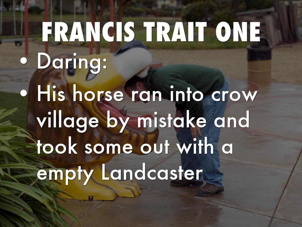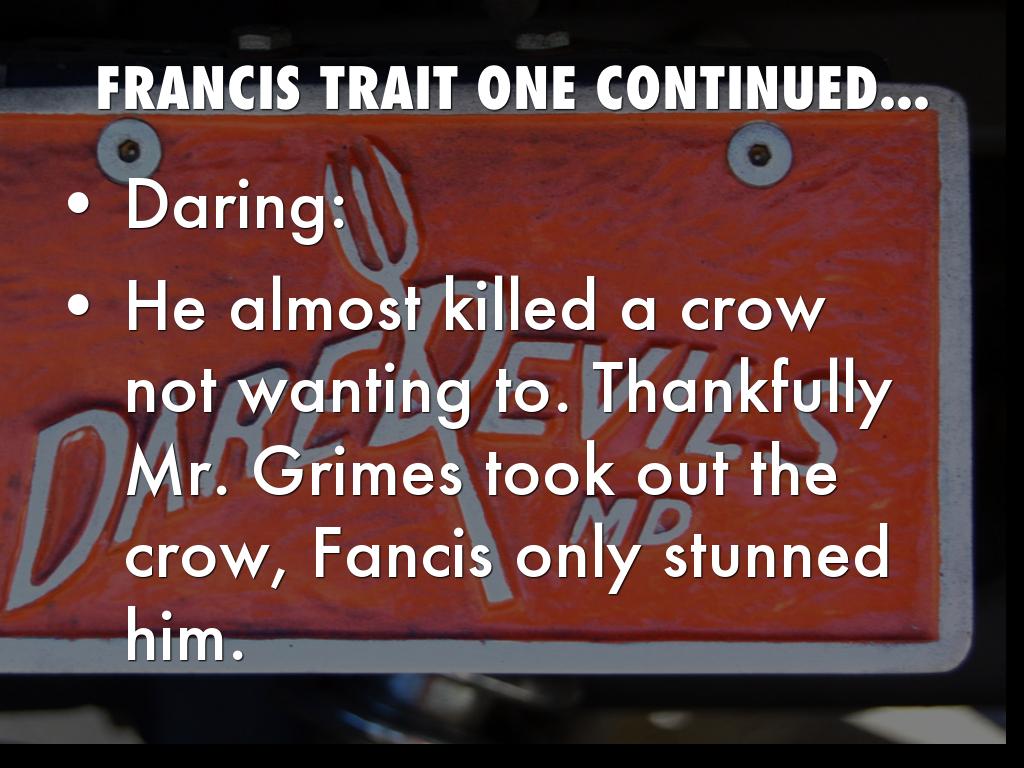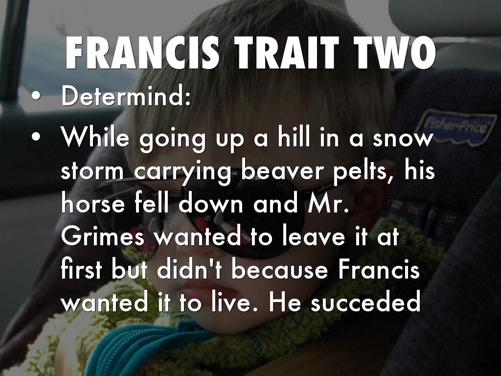 While going up a hill in a snow storm carrying beaver pelts, his horse fell down and Mr. Grimes wanted to leave it at first but didn't because Francis wanted it to live. He succeded