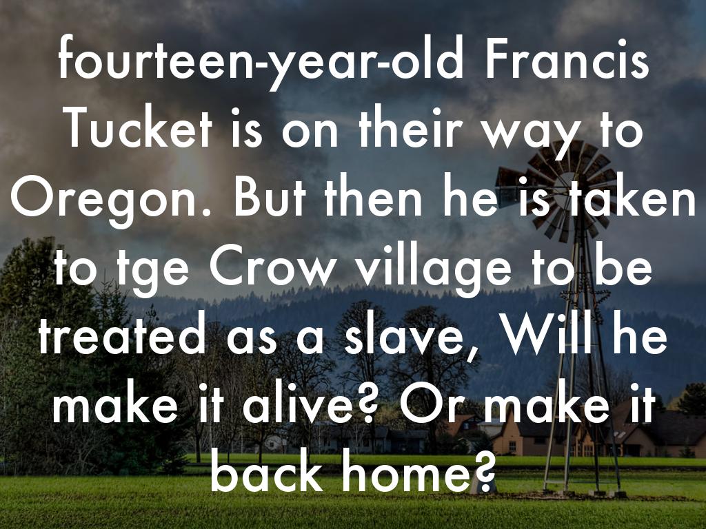 fourteen-year-old Francis Tucket is on their way to Oregon. But then he is taken to tge Crow village to be treated as a slave, Will he make it alive? Or make it back home?