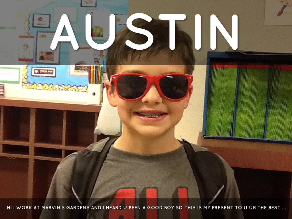 HI I WORK AT MARVIN'S GARDENS AND I HEARD U BEEN A GOOD BOY SO THIS IS MY PRESENT TO U UR THE BEST TEACHER EVER AND I WILL HAVE A HARD TIME WITHOUT YOU SO I WILL MISS U FOREVER AND HI