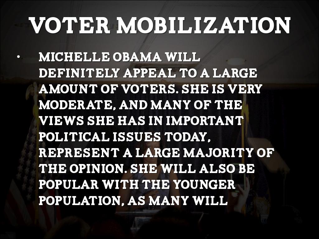 Michelle Obama will definitely appeal to a large amount of voters. She is very moderate, and many of the views she has in important political issues today, represent a large majority of the opinion. She will also be popular with the younger population, as many will remember her as the former First Lady, and how influential she was. The plan for mobilizing voters will definitely include the usual campaign speeches and meet and greets, but also a lot of social media interaction in order to mobilize the younger population