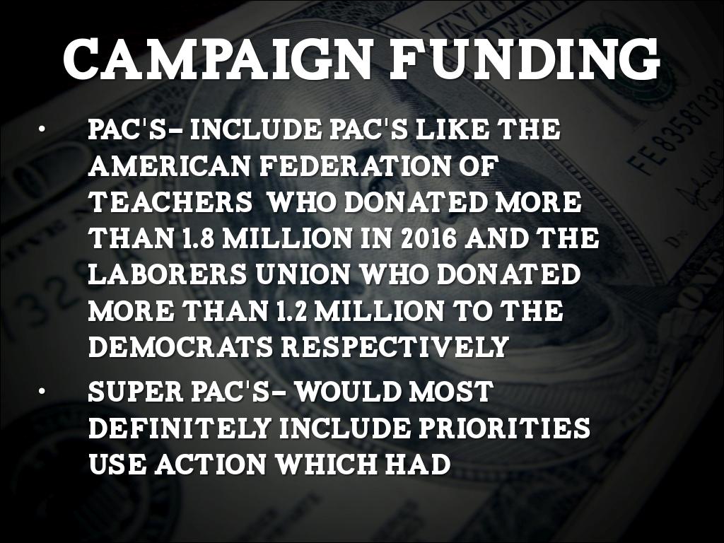 PAC's- include PAC's like the American federation of teachers who donated more than 1.8 million in 2016 and the laborers Union who donated more than 1.2 million to the democrats respectively