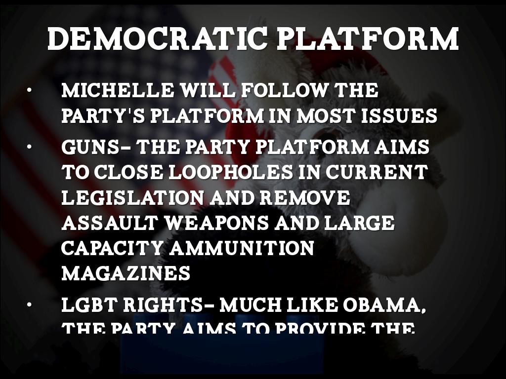 LGBT rights- much like Obama, the party aims to provide the lgbt community with the ability to live with dignity, security, and respect regardless of sexual orientation