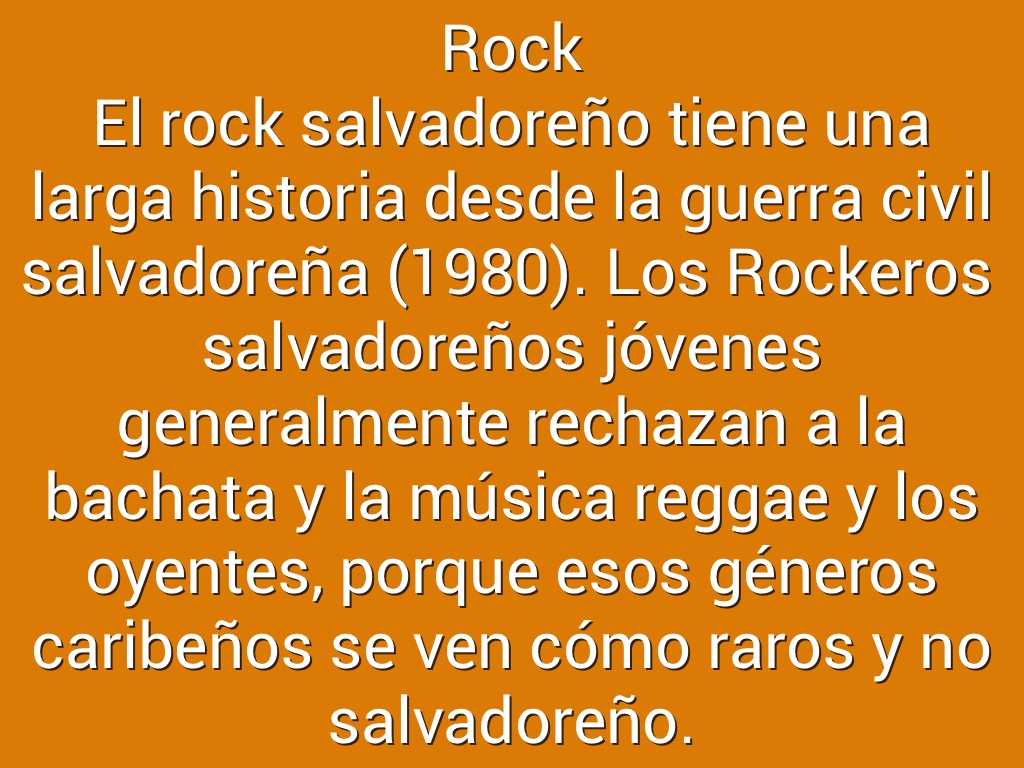 El rock salvadoreño tiene una larga historia desde la guerra civil salvadoreña (1980). Los Rockeros salvadoreños jóvenes generalmente rechazan a la bachata y la música reggae y los oyentes, porque esos géneros caribeños se ven cómo raros y no salvadoreño.