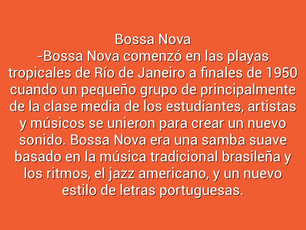 -Bossa Nova comenzó en las playas tropicales de Río de Janeiro a finales de 1950 cuando un pequeño grupo de principalmente de la clase media de los estudiantes, artistas y músicos se unieron para crear un nuevo sonido. Bossa Nova era una samba suave basado en la música tradicional brasileña y los ritmos, el jazz americano, y un nuevo estilo de letras portuguesas.