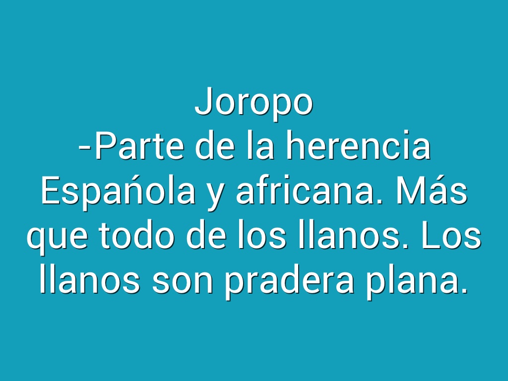 -Parte de la herencia Espańola y africana. Más que todo de los llanos. Los llanos son pradera plana.
