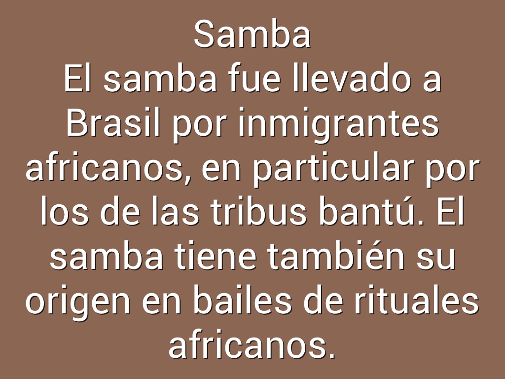 El samba fue llevado a Brasil por inmigrantes africanos, en particular por los de las tribus bantú. El samba tiene también su origen en bailes de rituales africanos.
