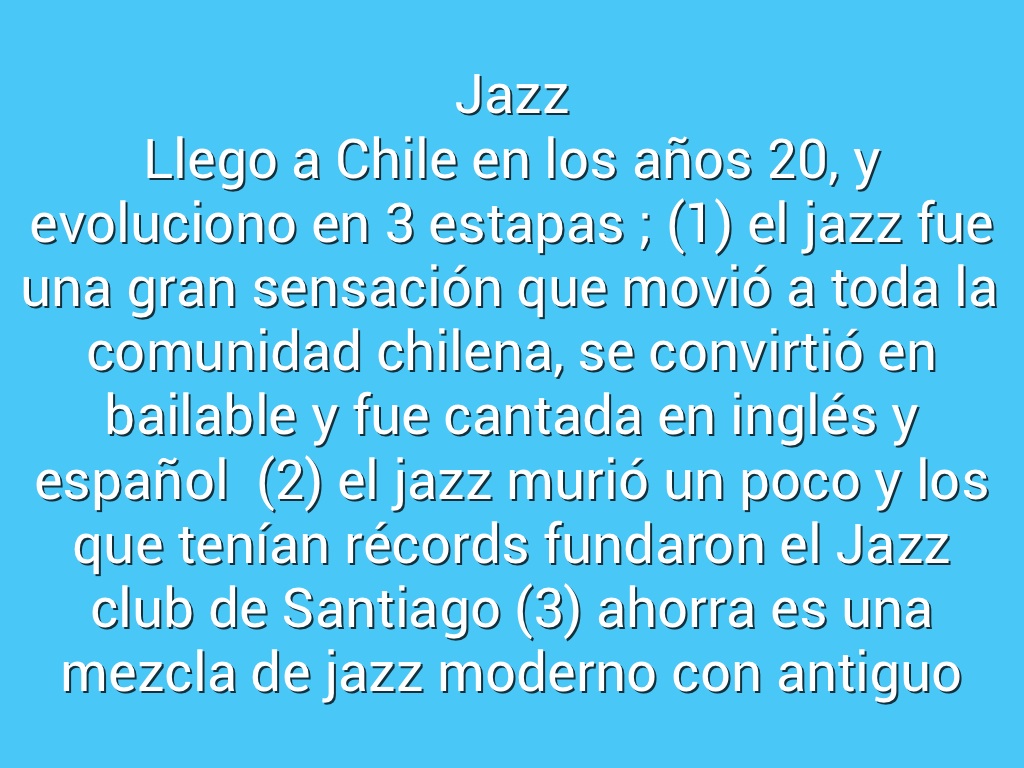 Llego a Chile en los años 20, y evoluciono en 3 estapas ; (1) el jazz fue una gran sensación que movió a toda la comunidad chilena, se convirtió en bailable y fue cantada en inglés y español (2) el jazz murió un poco y los que tenían récords fundaron el Jazz club de Santiago (3) ahorra es una mezcla de jazz moderno con antiguo