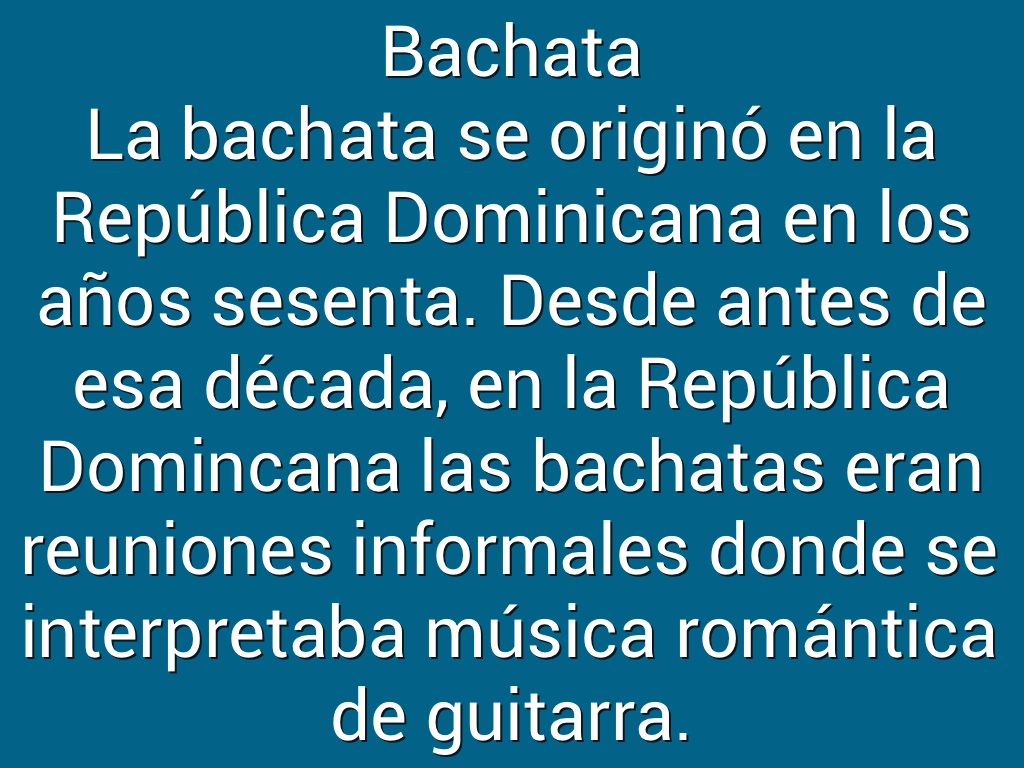 La bachata se originó en la República Dominicana en los años sesenta. Desde antes de esa década, en la República Domincana las bachatas eran reuniones informales donde se interpretaba música romántica de guitarra.