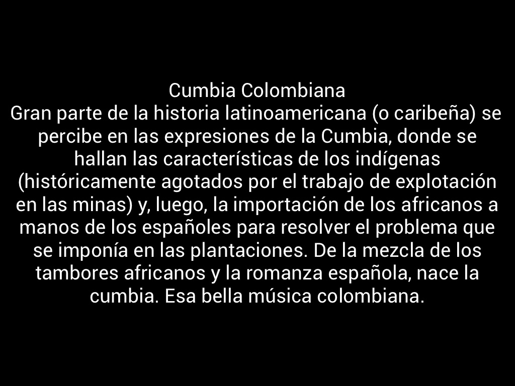 Gran parte de la historia latinoamericana (o caribeña) se percibe en las expresiones de la Cumbia, donde se hallan las características de los indígenas (históricamente agotados por el trabajo de explotación en las minas) y, luego, la importación de los africanos a manos de los españoles para resolver el problema que se imponía en las plantaciones. De la mezcla de los tambores africanos y la romanza española, nace la cumbia. Esa bella música colombiana.