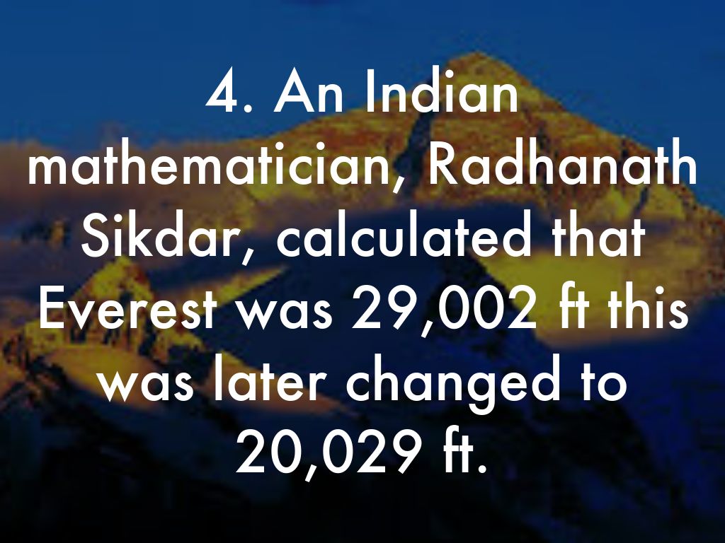 4. An Indian mathematician, Radhanath Sikdar, calculated that Everest was 29,002 ft this was later changed to 20,029 ft.