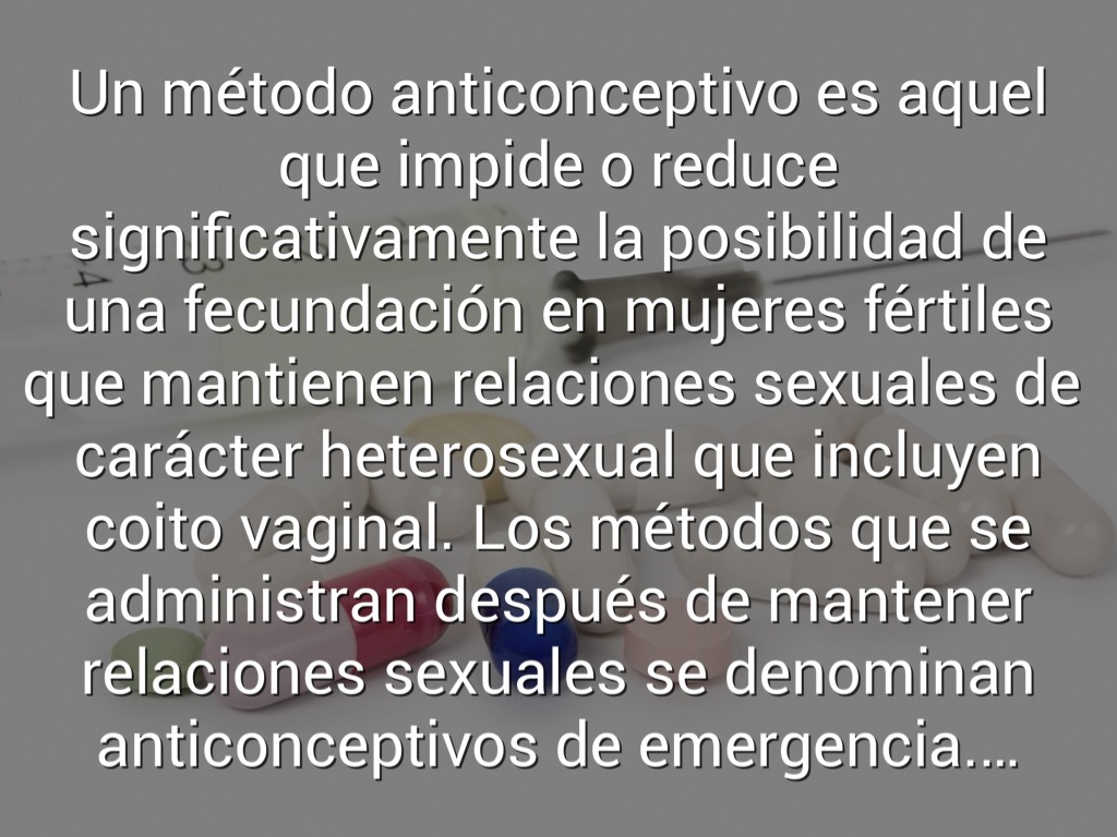 Un método anticonceptivo es aquel que impide o reduce significativamente la posibilidad de una fecundación en mujeres fértiles que mantienen relaciones sexuales de carácter heterosexual que incluyen coito vaginal. Los métodos que se administran después de mantener relaciones sexuales se denominan anticonceptivos de emergencia.