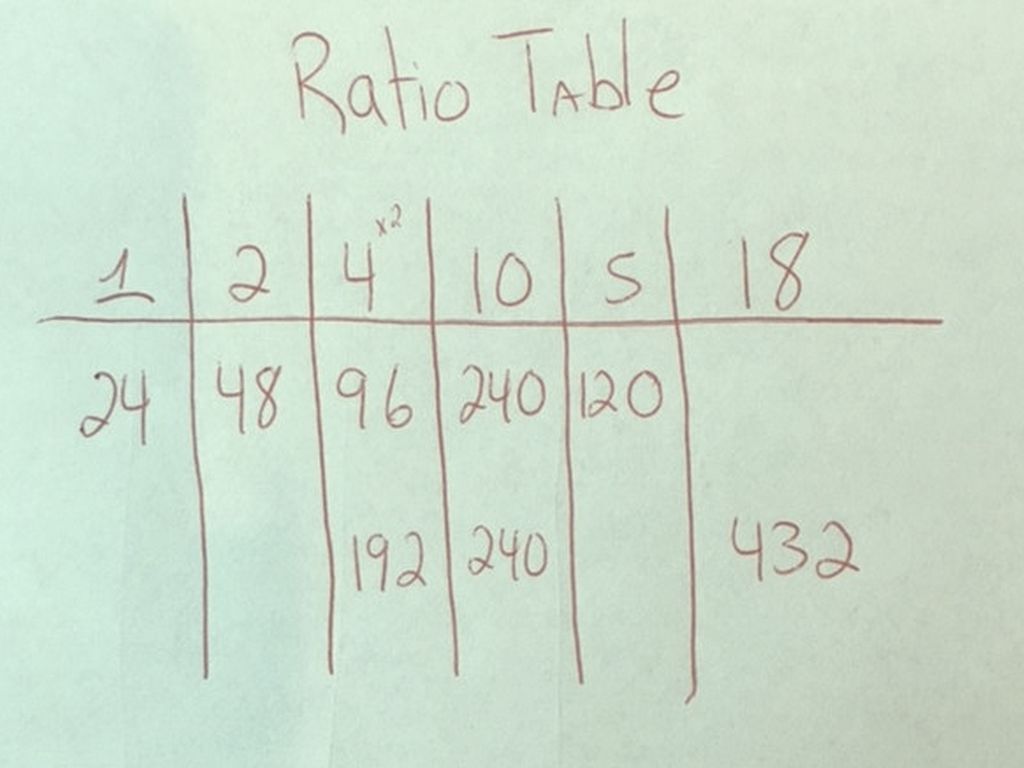 The ratio table is amazing. I have 24 students and I need to find out our total box tops if each student brings in 18. In a ration table you always have 1 of something. Then 2, 4, 10 and 5 make up the core four. With these numbers you can pretty much get to any higher number by doubling and adding. To get 18 I doubled my 4 and added it to 10 for 18. We would have 432 box tops!