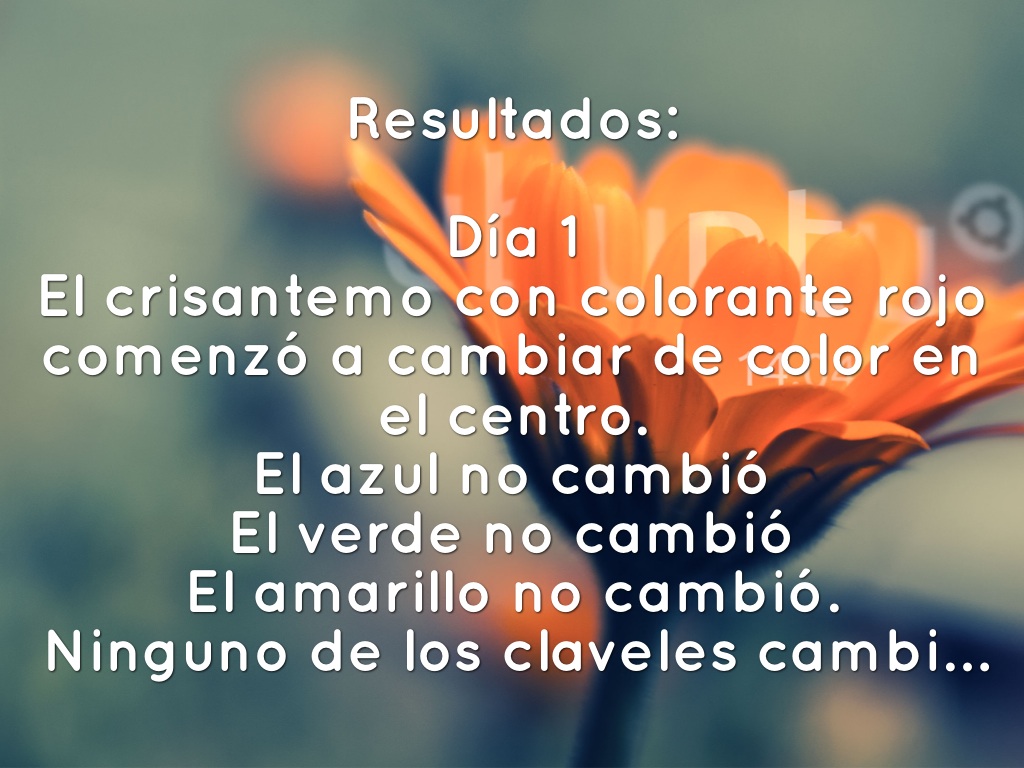 Día 1 El crisantemo con colorante rojo comenzó a cambiar de color en el centro. El azul no cambió El verde no cambió El amarillo no cambió. Ninguno de los claveles cambió.