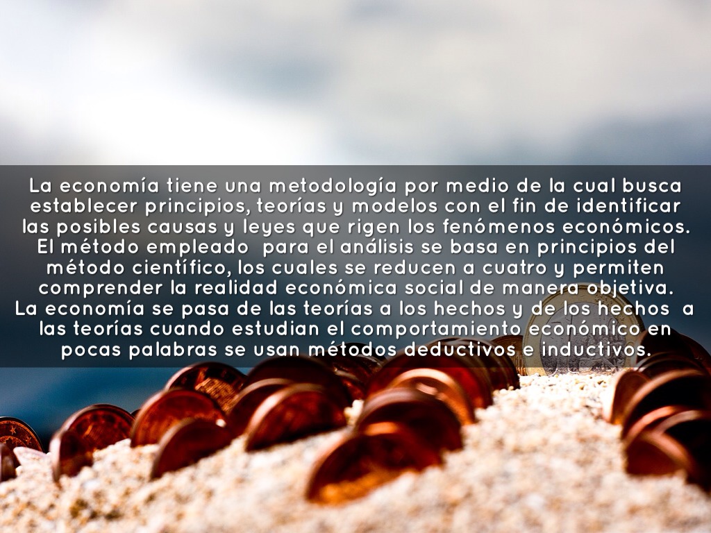 La economía tiene una metodología por medio de la cual busca establecer principios, teorías y modelos con el fin de identificar las posibles causas y leyes que rigen los fenómenos económicos. El método empleado para el análisis se basa en principios del método científico, los cuales se reducen a cuatro y permiten comprender la realidad económica social de manera objetiva. La economía se pasa de las teorías a los hechos y de los hechos a las teorías cuando estudian el comportamiento económico en pocas palabras se usan métodos deductivos e inductivos.