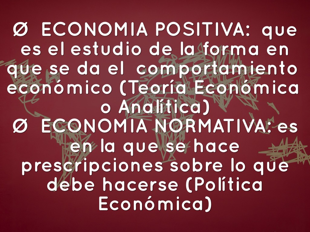 Ø ECONOMIA POSITIVA: que es el estudio de la forma en que se da el comportamiento económico (Teoría Económica o Analítica) Ø ECONOMIA NORMATIVA: es en la que se hace prescripciones sobre lo que debe hacerse (Política Económica)