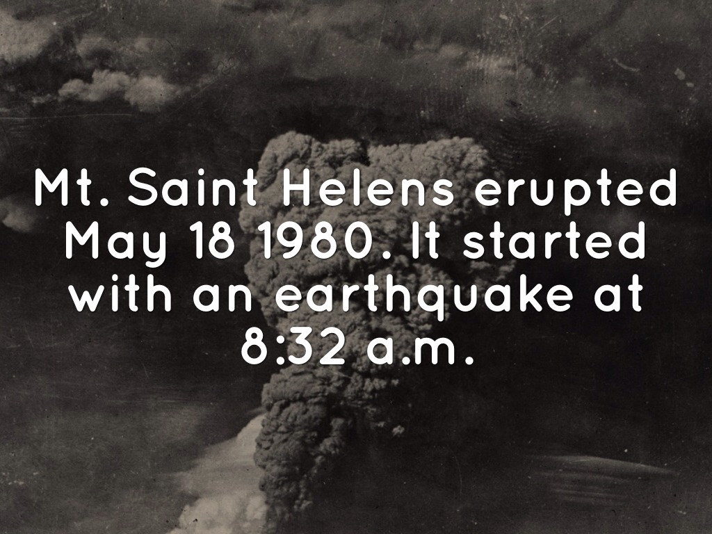 Mt. Saint Helens erupted May 18 1980. It started with an earthquake at 8:32 a.m.