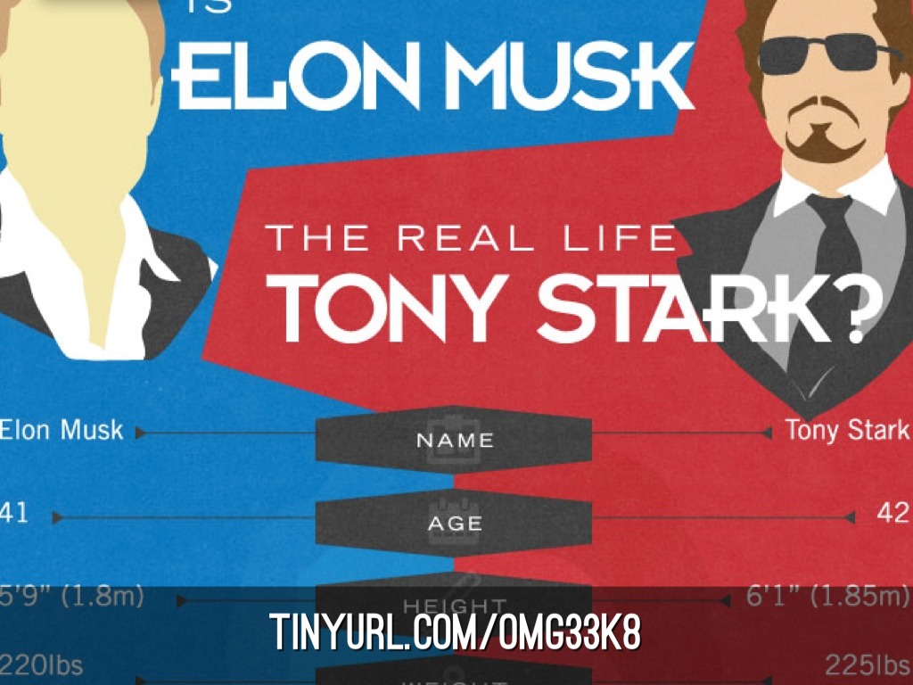 By showing data visually, infographics can help us re-see relationships and answer questions in new ways. This infographic by VCARS poses a question -- Is Elon Musk the real life Tony Stark? -- and then visually compares the two. The full infographic can be seen at