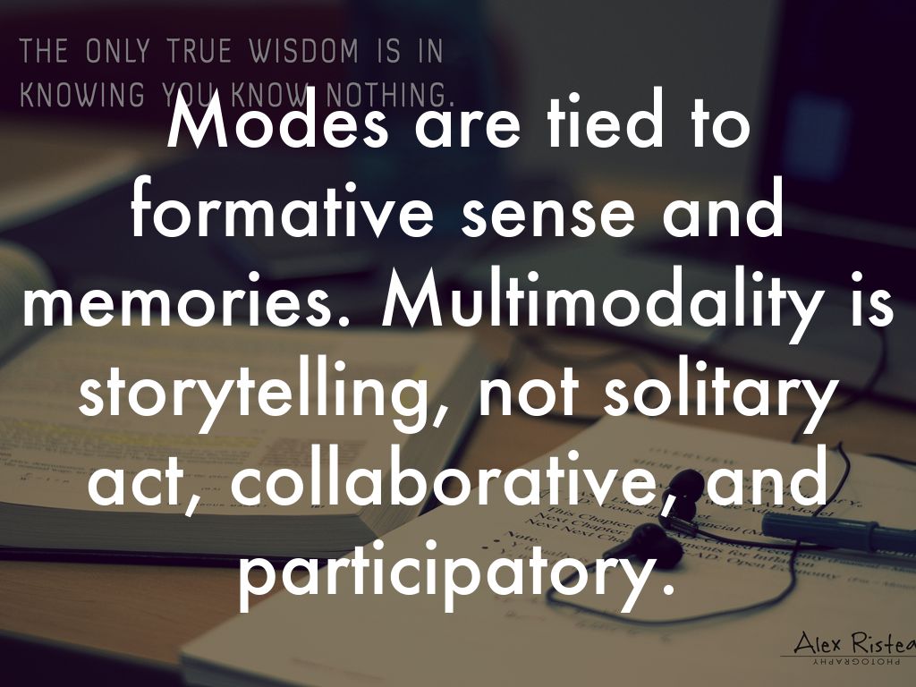 Modes are tied to formative sense and memories. Multimodality is storytelling, not solitary act, collaborative, and participatory.