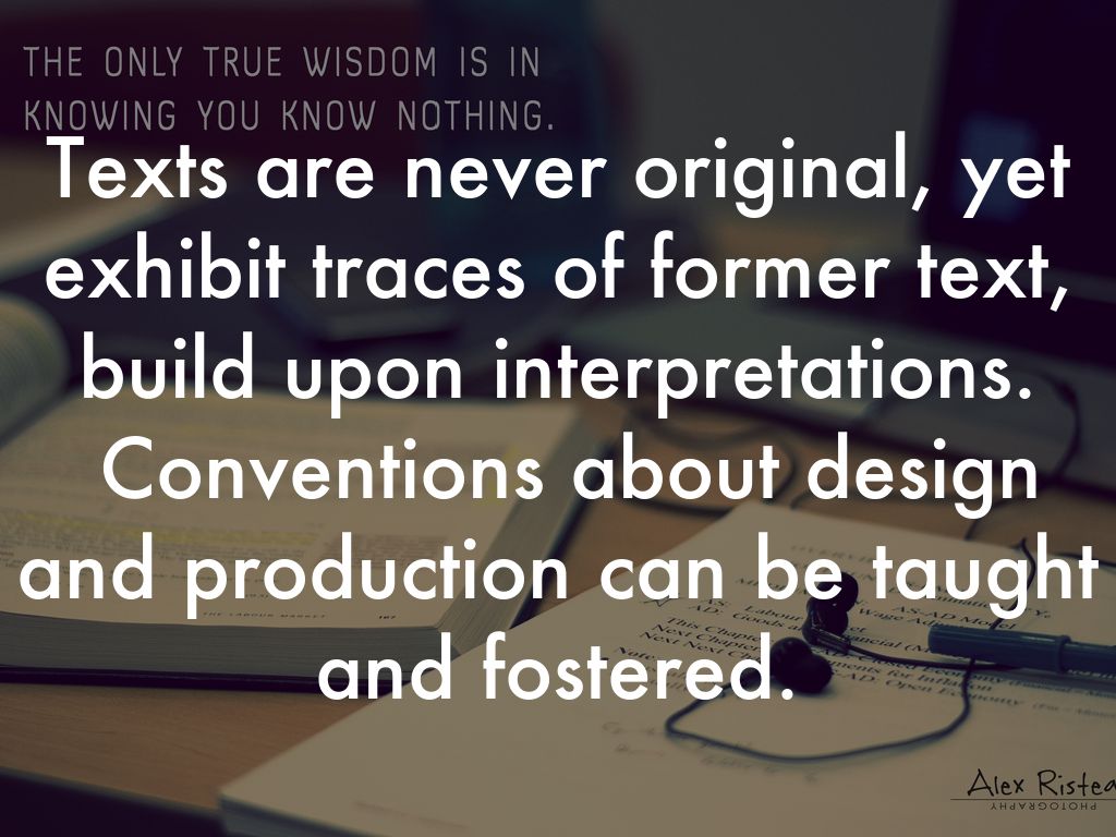 Texts are never original, yet exhibit traces of former text, build upon interpretations. Conventions about design and production can be taught and fostered.
