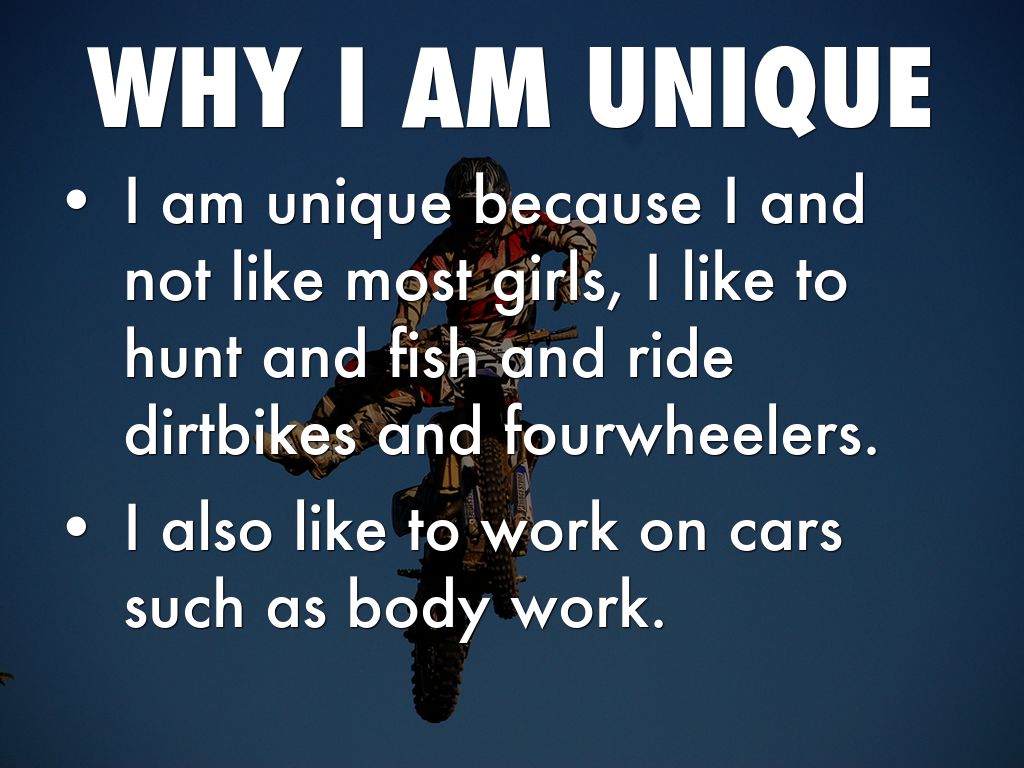 • I am unique because I and not like most girls, I like to hunt and fish and ride dirtbikes and fourwheelers.