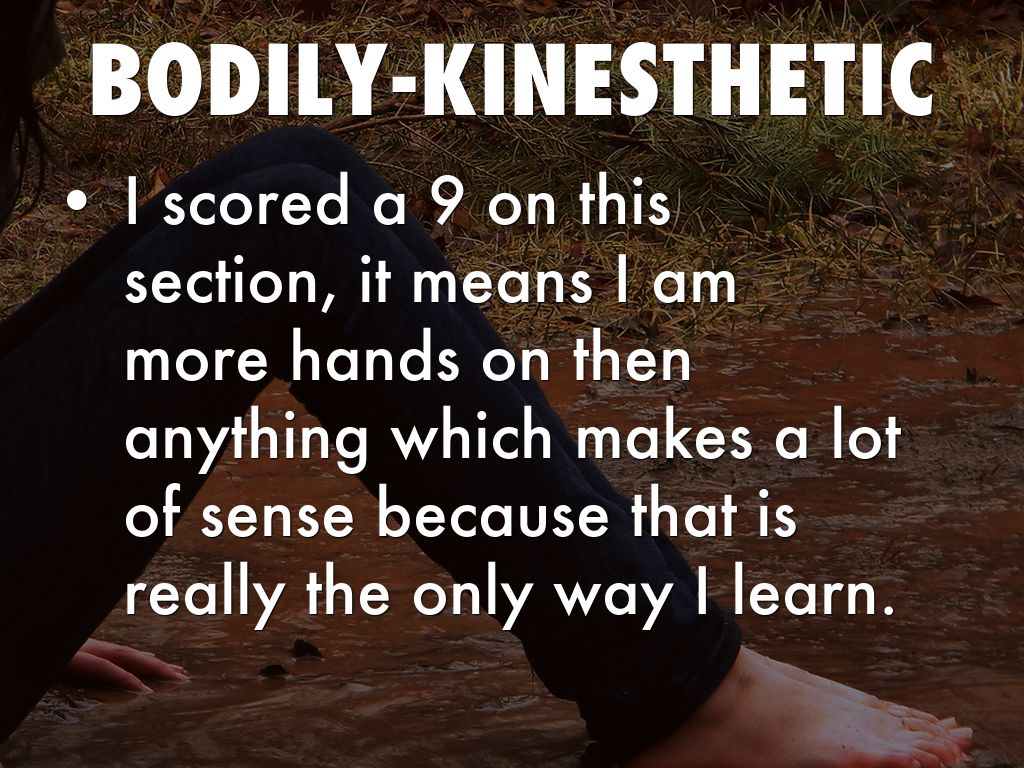 • I scored a 9 on this section, it means I am more hands on then anything which makes a lot of sense because that is really the only way I learn.