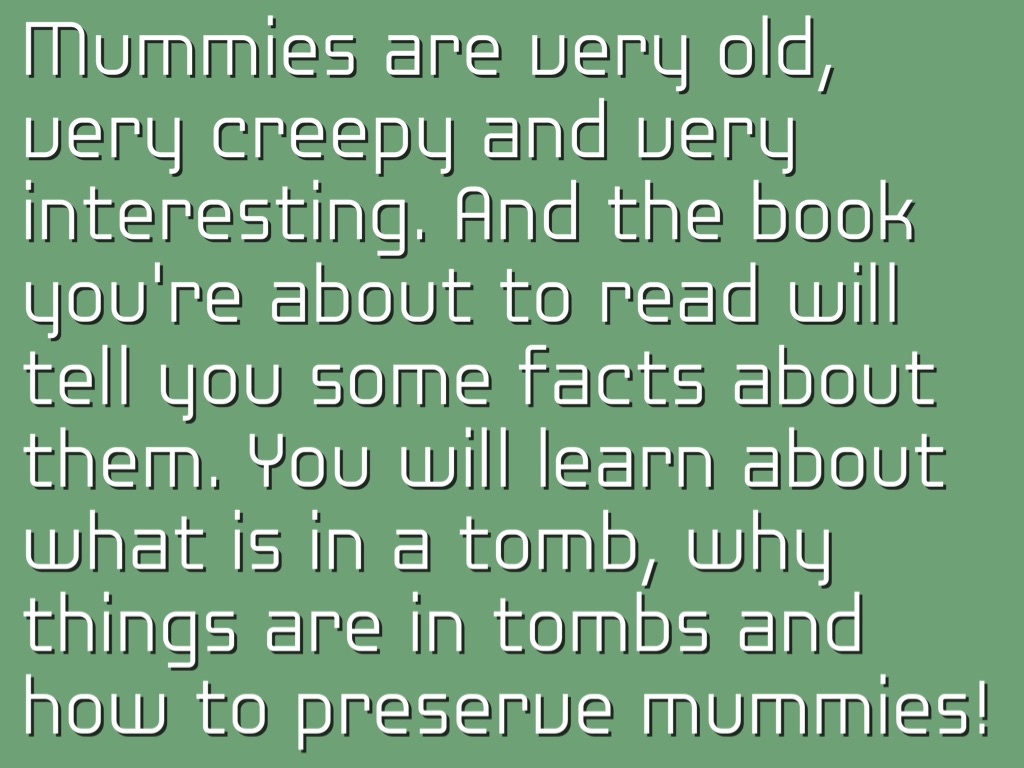 Mummies are very old, very creepy and very interesting. And the book you're about to read will tell you some facts about them. You will learn about what is in a tomb, why things are in tombs and how to preserve mummies!