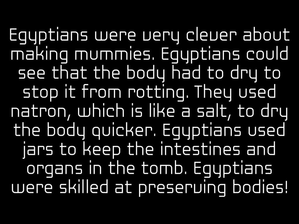 Egyptians were very clever about making mummies. Egyptians could see that the body had to dry to stop it from rotting. They used natron, which is like a salt, to dry the body quicker. Egyptians used jars to keep the intestines and organs in the tomb. Egyptians were skilled at preserving bodies!