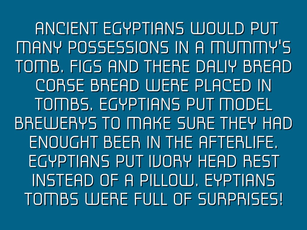 ANCIENT EGYPTIANS WOULD PUT MANY POSSESSIONS IN A MUMMY'S TOMB. FIGS AND THERE DALIY BREAD CORSE BREAD WERE PLACED IN TOMBS. EGYPTIANS PUT MODEL BREWERYS TO MAKE SURE THEY HAD ENOUGHT BEER IN THE AFTERLIFE. EGYPTIANS PUT IVORY HEAD REST INSTEAD OF A PILLOW. EYPTIANS TOMBS WERE FULL OF SURPRISES!