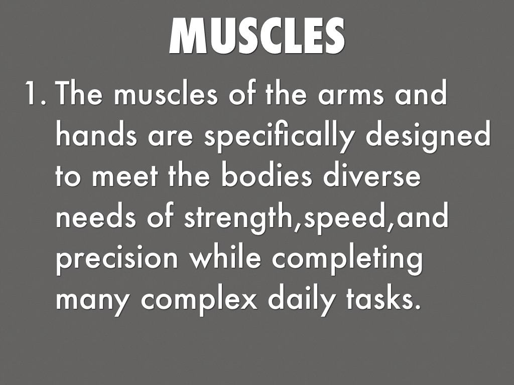 The muscles of the arms and hands are specifically designed to meet the bodies diverse needs of strength,speed,and precision while completing many complex daily tasks.