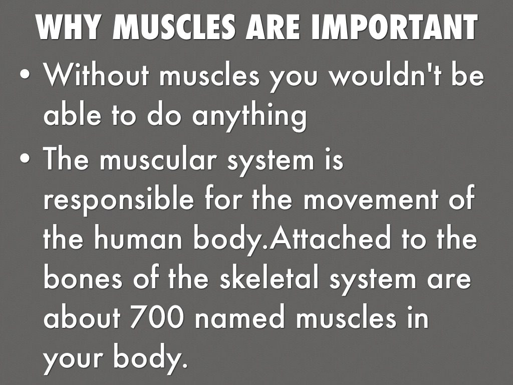 The muscular system is responsible for the movement of the human body.Attached to the bones of the skeletal system are about 700 named muscles in your body.